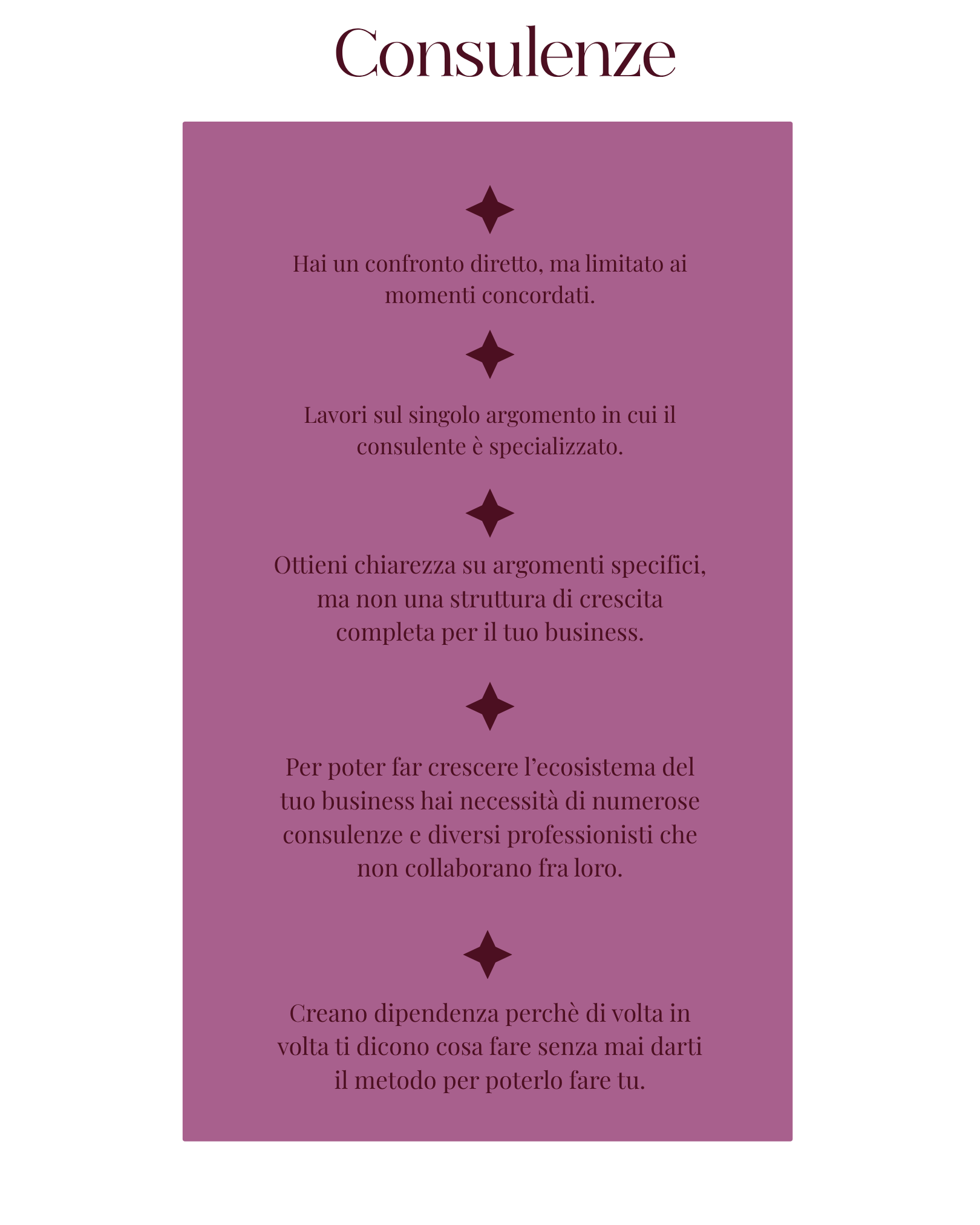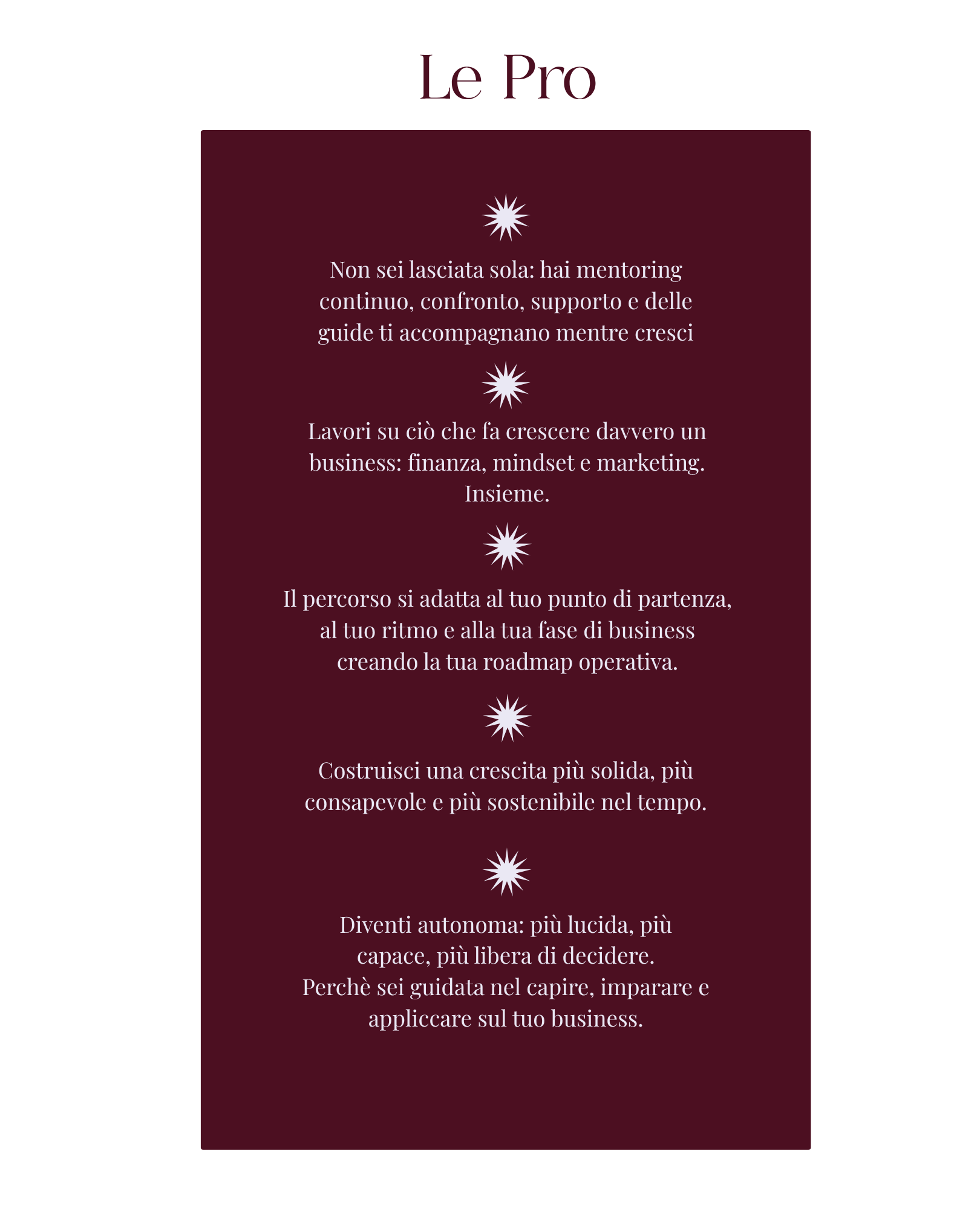 È un percorso strutturato in cui finanza, marketing, visione strategica e supporto si uniscono per aiutarti a costruire un business più solido, più chiaro e più indipendente.